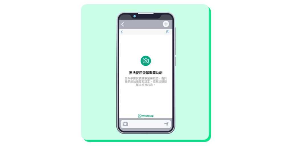 如果收件人企图截图或录屏,WhatsApp会弹出「无法截图」提示,防范有人在未得到发讯人同意下,擅自将多媒体留底。