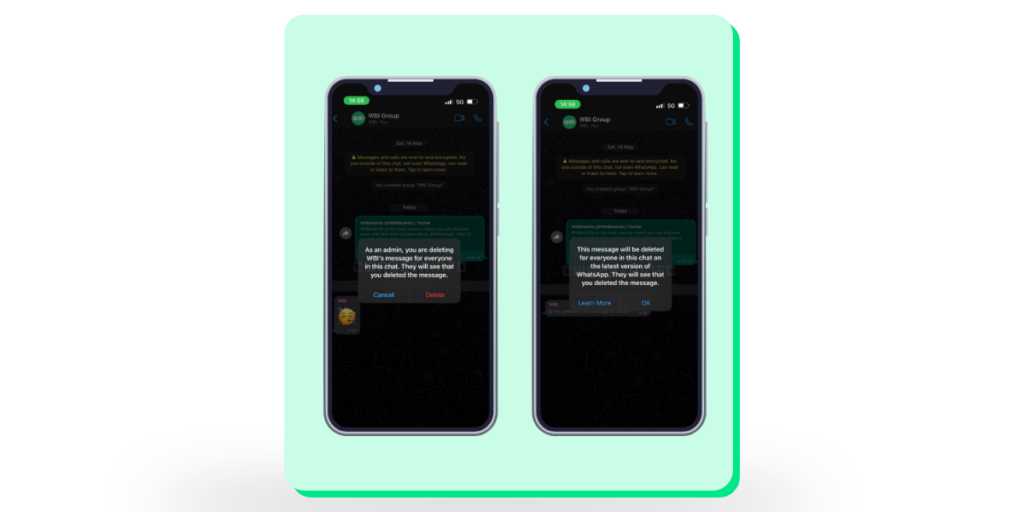 为了进一步加强隐私保护,WhatsApp将原有的一小时限制,延长至2天。也就是在消息传达后,发信人可在大约2天内撤回消息,而群组管理员也可以在这段期间要求在所有人的手机上删除。