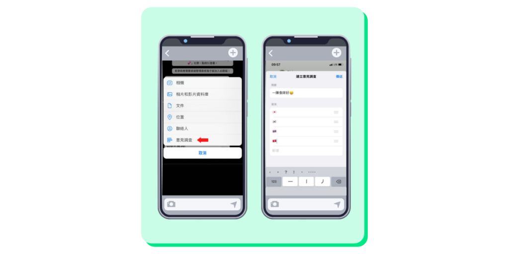 发信人只需点击左下角的“万字夹”或“+”符号>“意见调查”,简单输入问题并加入最多12个不同选项,即可发起投票,而群组成员也可以选择多于一个答案,易用又清晰。