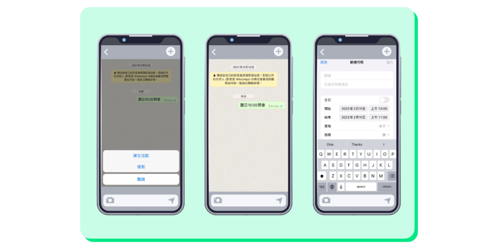 只要是在WhatsApp上输入与时间有关的文字,例如「今晚」、「明天」、「10点」等等,都会被系统加上下划线。如果你希望在个人行事历储存下行程,只需要长按下划线文字,然后选择「制作事件」,就能跳转到行事历中建立行程提醒,方便又快捷。