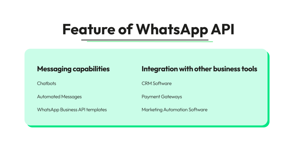 WhatsApp Business API can be integrated with various business tools, such as customer relationship management (CRM) software, payment gateways, and marketing automation software. This enables businesses to streamline their operations and manage their customer interactions more effectively.